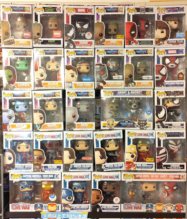 マーベル(Marvel)の人気キャラクターを集めたFUNKO POP!フィギュアのコレクションです。スパイダーマン、アイアンマン、キャプテンアメリカ、ブラックパンサーなど、映画・コミックでおなじみのヒーローたちが勢揃い。通常版からレア限定品まで幅広くラインナップしています。